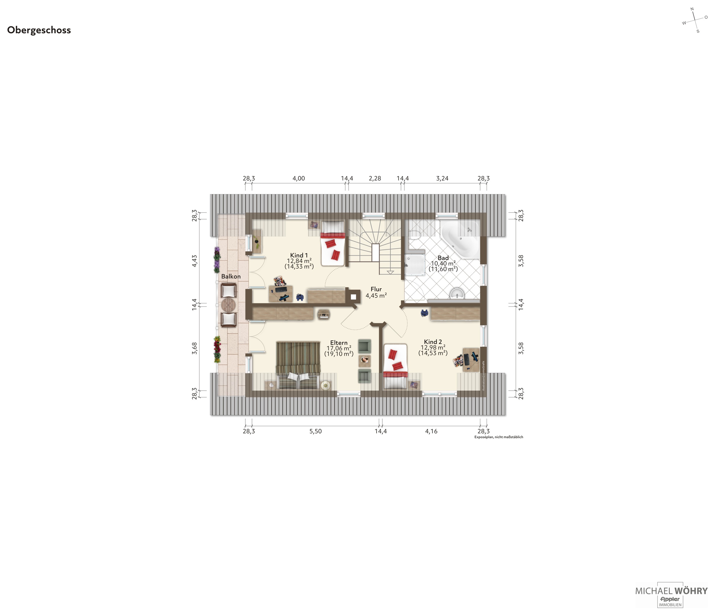 Das Obergeschoss beherbergt drei geräumige Zimmer, die flexibel genutzt werden können. Zwei dieser Zimmer verfügen über einen direkten Zugang zum Westbalkon, von dem sich ebenfalls ein herrlicher Fernblick eröffnet. Abgerundet wird die obere Etage durch ein komfortables Tageslichtbad. Auf mehr als zehn Quadratmetern bietet es eine Badewanne, eine separate Dusche, ein WC und ein Waschbecken.